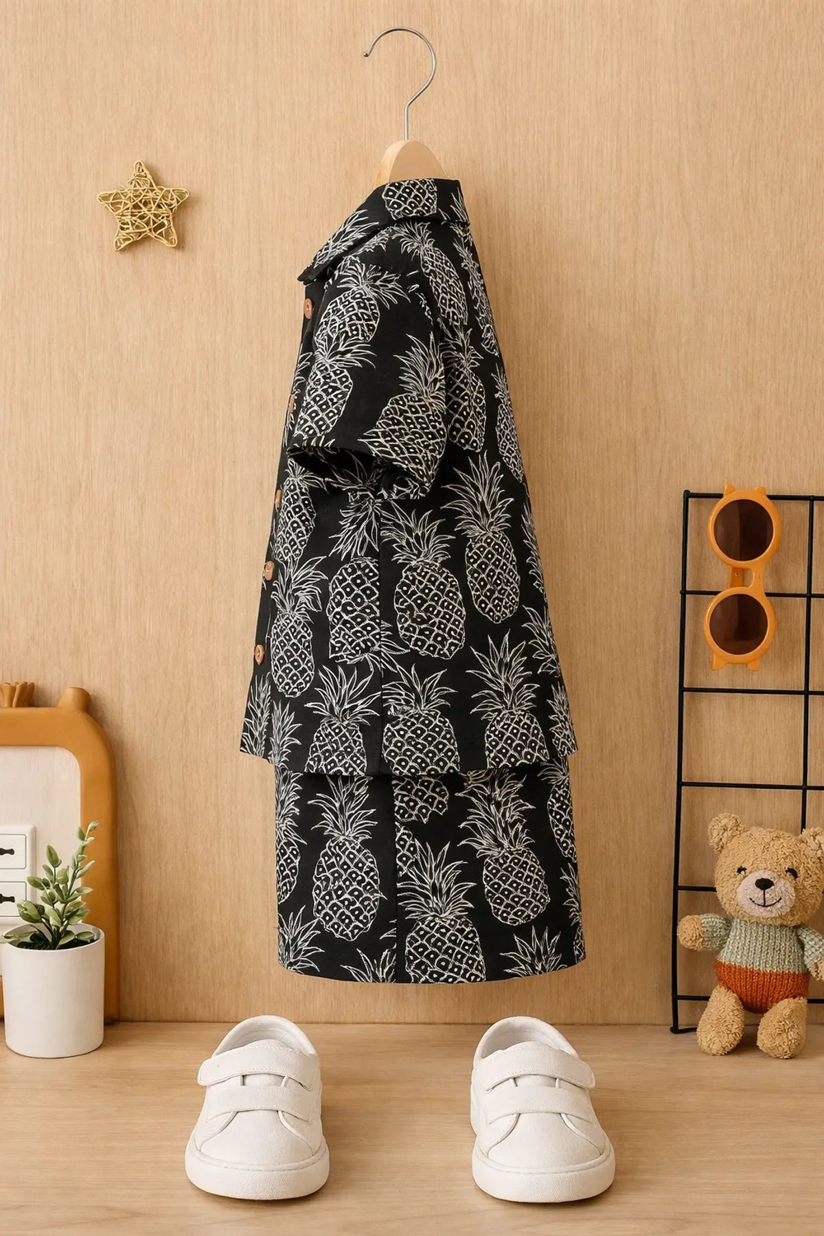 The Ultimate Summer Uniform! ☀️ Get your little one ready for "Vacation Mode" with this fan-favorite two-piece set! Featuring a bold white pineapple print on a classic black backdrop, it’s the perfect mix of cool-kid style and all-day comfort. 🕶️✨